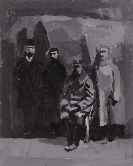 Four Figures In Coats, acrylic on paper mounted on canvas, 24x30cm, 2010 650€